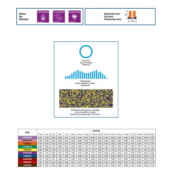 Hollow cone nozzle with ceramic insert and Delrin® body. Hollow cone Ceramic nozzles spray small drops and ensure excellent coverage. Suitable for orchard sprayer. Perfect for trees and bushes without requiring the use of air. It limits overspray even in case of rows preventing the use of nozzles with a wider angle. Suitable for herbicides, fungicides, and pesticides.