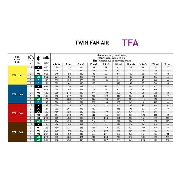 Their three-piece structure allows for easier cleaning operations. They ensure a good coverage and enhance product penetration and settling. Twin Fan Air nozzles have the same rate as Twin Fan Standard nozzles but spray larger drops and therefore ensure reduced drift. Twin nozzles - two spraying points in one body. Suitable for boom spraying, especially onto potatoes, onions and grains. Filtration should be half the value of a standard nozzle. Made of molded Delrin®, a polymer ensuring high chemical stability and an exceptionally long useful life. Suitable for herbicides, fungicides and pesticides. Click on "Add Optional Product" for more color options.