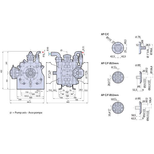 This pump is designed for low-pressure systems and has been made resistant to aggressive fluids. Safety has been enhanced with sturdy mounting feet, a safety valve, and cardan protection. This design offers high performance in areas such as chemical and agricultural pesticide spraying.