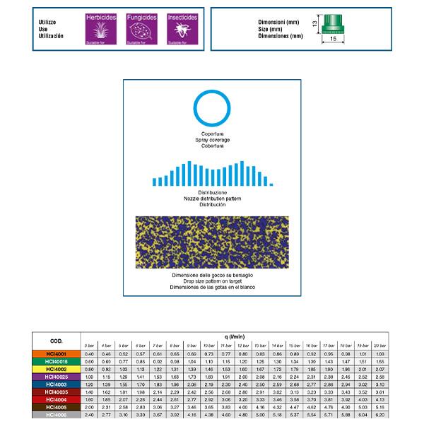 Hollow cone nozzle with ceramic insert and Delrin® body. Hollow cone Ceramic nozzles spray small drops and ensure excellent coverage. Suitable for orchard sprayer. Perfect for trees and bushes without requiring the use of air. It limits overspray even in case of rows preventing the use of nozzles with a wider angle. Suitable for herbicides, fungicides, and pesticides.